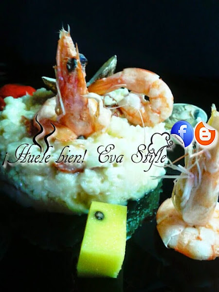 5.- Colocamos un aro de decorar sobre un plato, lo rellenamos con el ristto. Retiramos el aro, ponemos sobre el risotto dos langostinos, colocamos también la cabeza con la hemos hecho el caldo. Ponemos una almeja con dentro de su concha. Alrededor colocamos unos langostinos, un trozo pequeño de queso y unas almejas con su concha.
