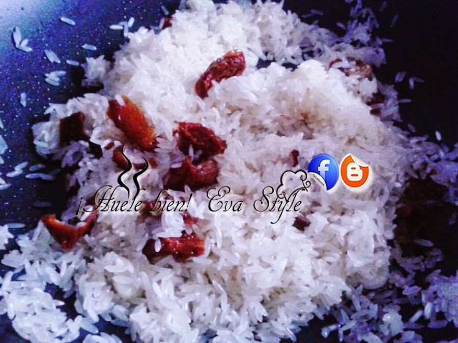 Añadimos un poco de aceite de oliva en una cazuela, lo calentamos un poco. Pelamos y cortamos en laminas los ajos, los rehogamos unos minutos sin dejar que estos se doren. Añadimos los tomates desidratados cortados en dos trozos cada uno. Dejamos que se cocine con los ajos unos minutos. Agregamos el arroz y rehogamos unos minutos sin dejar de remover. Vertemos el vaso de Platé blanco (PLATÉ es una bebida alcohólica obtenida por fermentación de plátanos de canarias)... También puede utilizar un vino blanco semi-dulce o afrutado. Los tomates desidratados y el queso son muy fuertes de sabor, el Platé le da un sabor exquisito al rissoto. Dejamos que se reduzca.