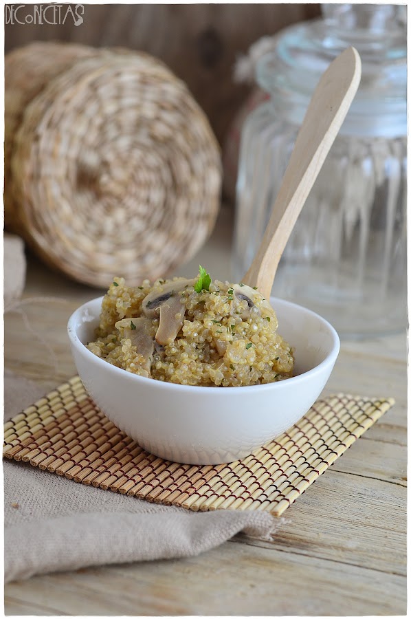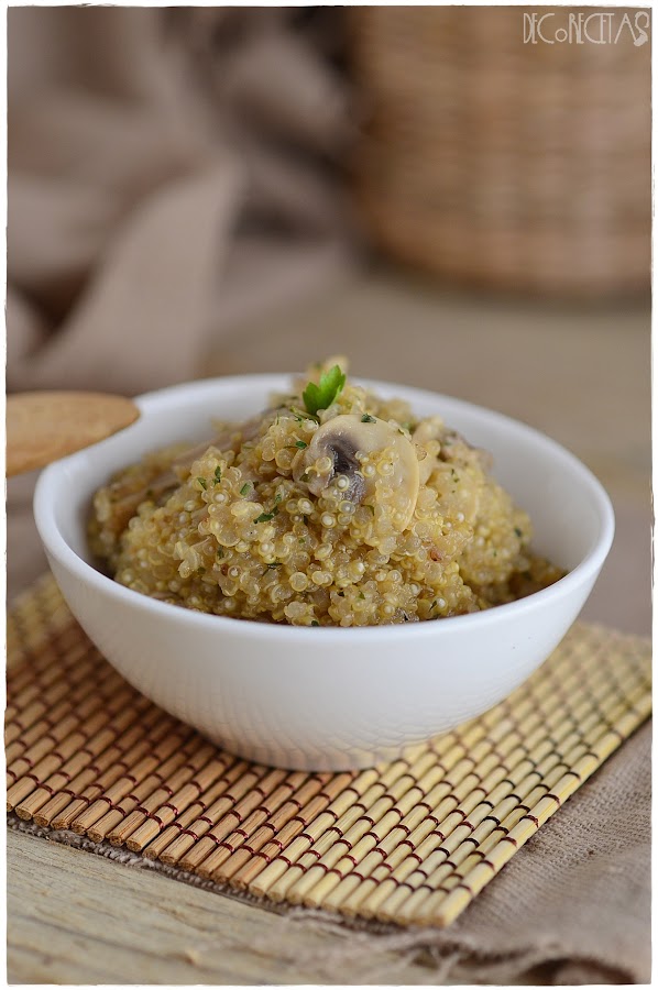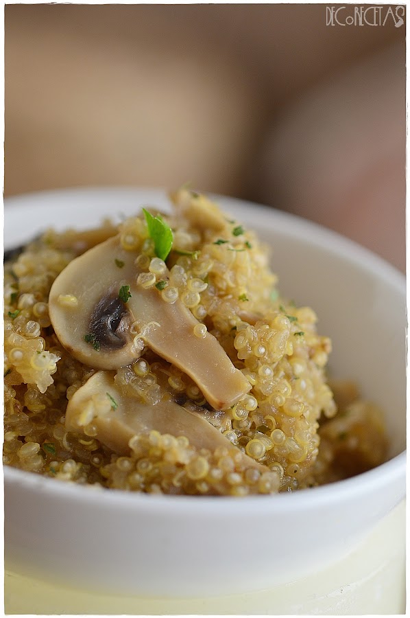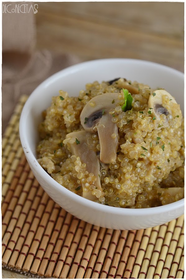 Sofreimos los champiñones en una gota de aceite y añadimos la quinoa previamente enjuagada en agua limpia. Agregamos el caldo de verdura, la sal y dejamos a fuego fuerte hasta que hierva. En ese momento, bajamos el fuego al mínimo y tapamos con una tapadera por unos 10 minutos, que una vez pasados, añadimos el queso y dejamos otros 5 minutos más.