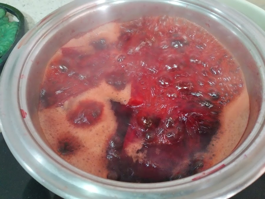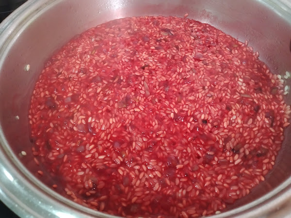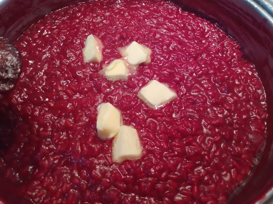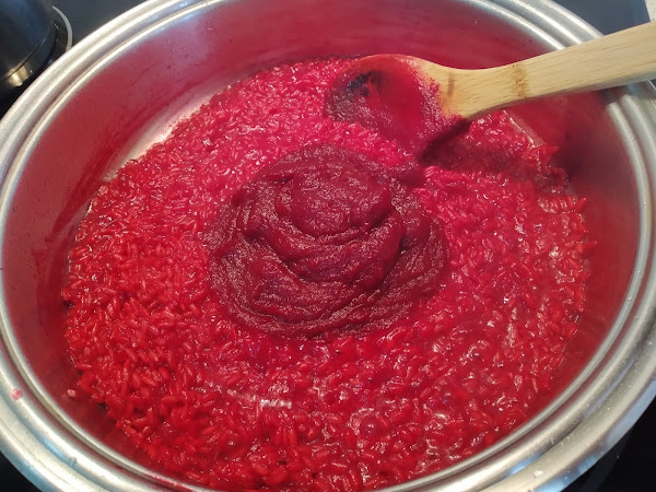 En ése momento el grano estará a medio cocer, en ése momento incorporar el puré de remolacha, remover y añadir un nuevo cucharón de caldo, salar al gusto, cuando el grano absorba todo el liquido, volver a repetir el echar un nuevo cucharón de liquido e ir repitiendo la operación durante, aproximadamente, 20 minutos.