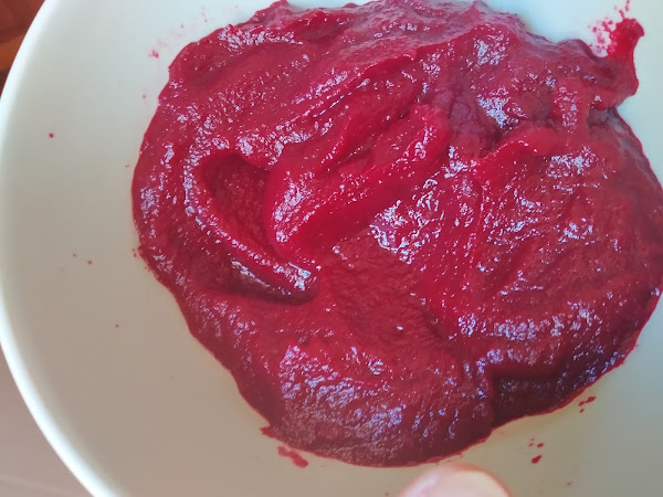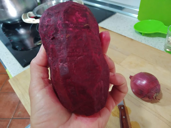 Pelar y trocear la remolacha. En una cacerola con un poco de sal, ponerla a cocer hasta que esté tierna. Apartar del fuego, sacar los trozos de remolacha, pasarla por la batidora hasta conseguir un puré homogéneo y reservar. Reservar igualmente el caldo que debe estar muy caliente, si es preciso volver a ponerlo al fuego.