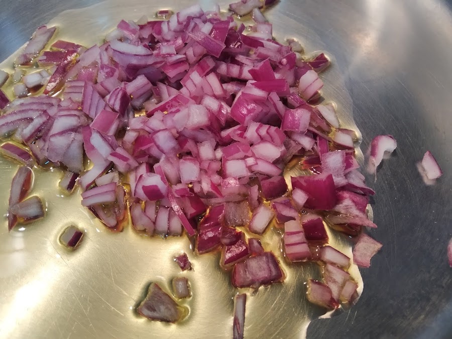 Pelar la cebolla y cortarla en trozos muy pequeños (el tamaño similar a los granos de arroz).