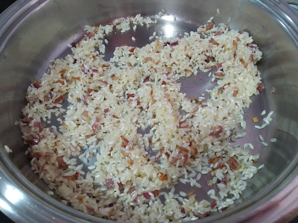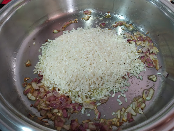 Echar en una cacerola plana, de base gruesa (que reparta bien el calor) el aceite y a fuego medio pochar la cebolla, hasta que comience a estar transparente. Agregar el arroz y rehogar un minuto, removiendo a fin de que se impregne bien de aceite por todos lados.