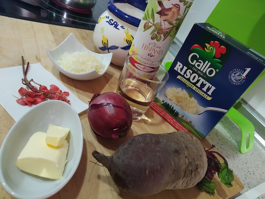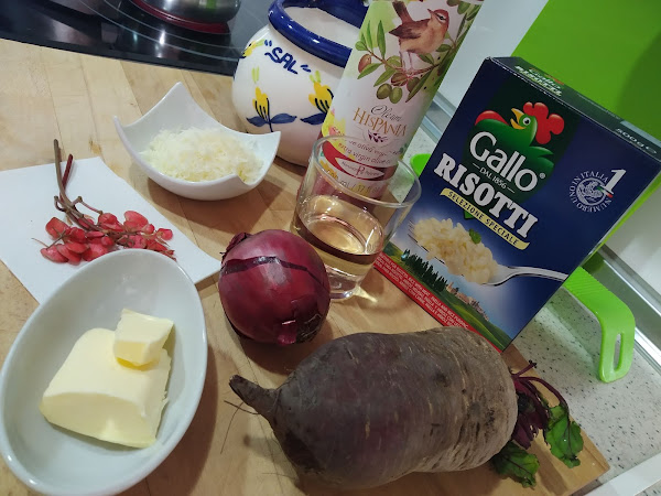 Una remolacha grande, ¾ litro del caldo de cocer la remolacha, 1/2 cebolla morada, seis cucharadas soperas de aceite de oliva virgen extra, medio vaso pequeño de vino blanco, 20 grms. de mantequilla, 40 grms. de queso manchego rallado, un vaso pequeño de arroz especial para risotto, sal y flores o pequeños brotes comestibles (opcional).