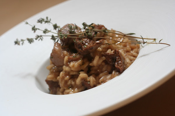 Añadimos la mantequilla al mismo aceite donde hemos frito la carne y cuando esté caliente, añadimos la cebolla, el ajo y el calabacín y salamos ligeramente, tapamos y dejamos pochar. Cuando esté pochadito, añadimos el vino tinto y dejamos evaporar. En este momento añadimos de nuevo la carne y las setas escurridas. Es importante que evaporéis bien el vino y lo echéis antes de la carne porque al ser un ácido, puede hacer que la carne se endurezca demasiado. Salteamos todo durante un par de minutos y añadimos el arroz, salamos (ojo, es importante añadir sal porque el arroz, no mucha porque ya la añadimos al caldo, a la carne y a las verduras, pero si el arroz queda soso, una vez cocido ya no se puede arreglar) . Removemos bien y tostamos de 3 a 5 minutos. A partir de este momento comenzamos a añadir cazos de caldo poco a poco, removiendo habitualmente el arroz. Una vez que haya absorbido el líquido, repetiremos la operación durante 20 minutos que es lo que tarda el arroz en cocerse. Una vez listo, añadimos el tomillo fresco (con cuidado de que no caigan ramitas) y el queso y removemos bien para mantecar el arroz y darle esa consistencia algo "pegajosa" que caracteriza al risotto. Ahora ya sólo toca emplatar y disfrutar de este delicioso plato.