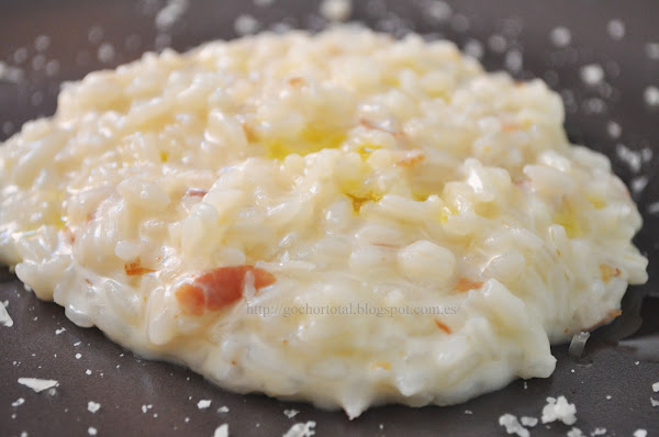 Para este plato he decidido no añadirle un ingrediente típico en los risotto como es la mantequilla, ya que añado mozzarella creo que no es necesario añadir mantequilla, si un poco de aceite de oliva para decorar.