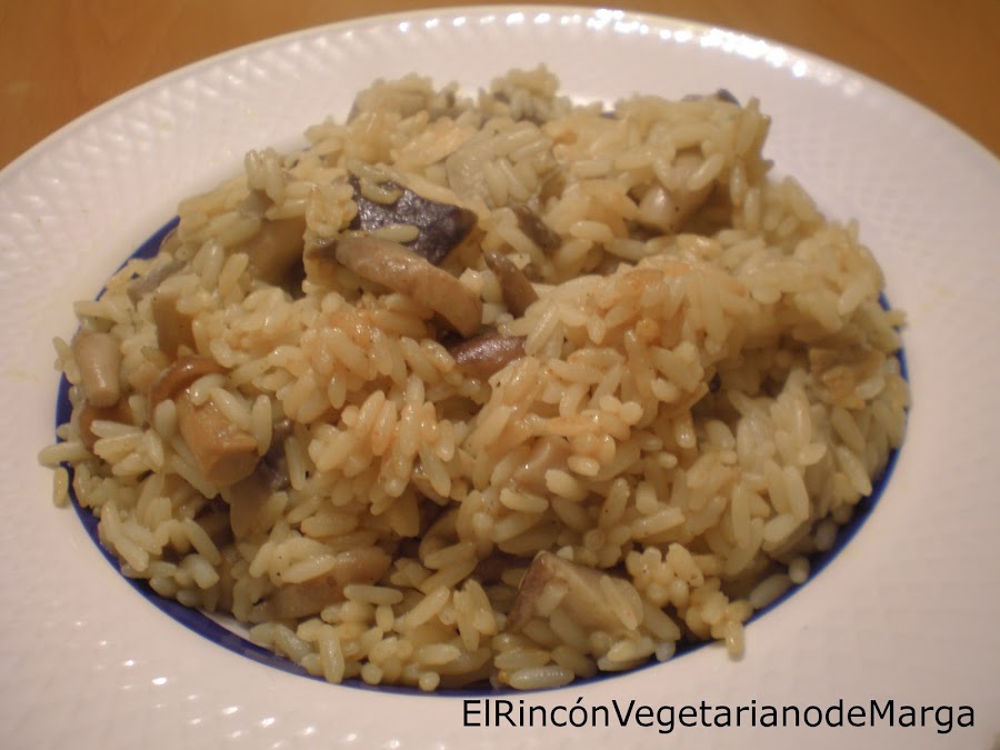 Hervimos el arroz durante unos 8 minutos. Limpiamos bien las setas (las setas shitake, si están deshidratadas se pueden hidratar en agua caliente unos minutos) y las cortamos en trozos grandes, las podemos partir por la mitad, o a daditos... Ponemos en una sartén aceite y doramos dos dientes de ajo, seguidamente añadimos todas las setas; las salteamos un minuto y seguidamente añadimos medio vaso de vino blanco. Lo dejamos reducir y ya estarán listas las setas. Escurrimos el arroz, lo mezclamos con el salteado de setas y añadimos sal y pimentón dulce.