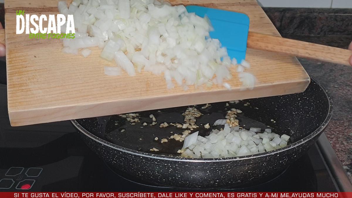 La cortamos en trocitos pequeños, más o menos como estos y la añadimos a la sartén junto con el ajo, le ponemos una pizca de sal para que la cebolla se poche antes y dejamos que se vaya pochando a fuego medio.