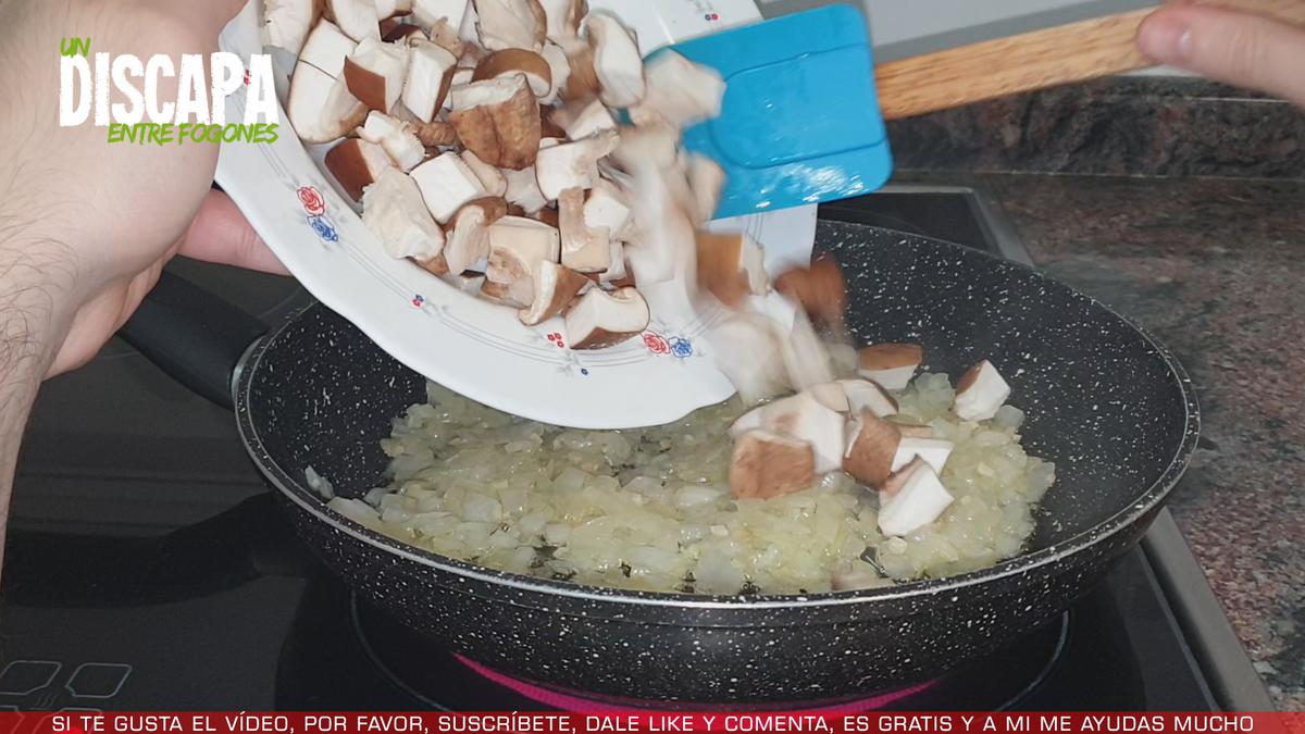 Cuando ya tenemos la cebolla pochada, añadimos las setas y dejamos que se cocinen a fuego medio.