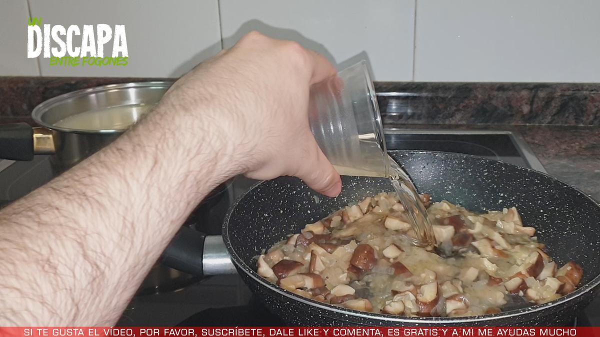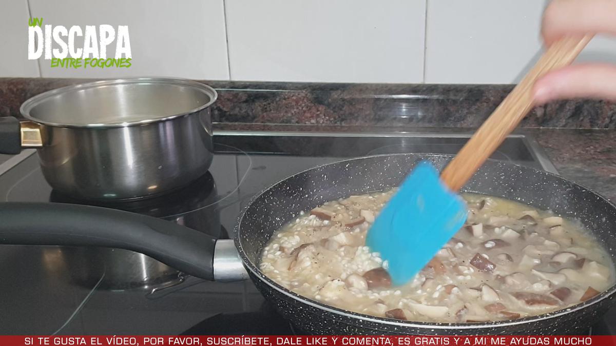 Ahora, mientras se van cocinando las setas, ponemos el caldo a hervir a fuego medio, tampoco hace falta que hierva a borbotones.