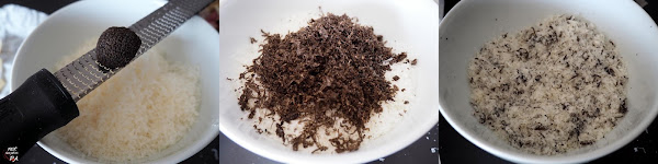 Rallar el parmesano sobre un bol hondo. Cortar unas finas láminas de trufa para decorar y a continuación rallar el resto. Mezclar con el parmesano y reservar.