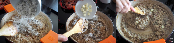 Momentos antes de acabar la cocción, añadir la mezcla de parmesano y trufa y remover para incorporarla al arroz. Rectificar de sal y pimienta. Añadir la matequilla cortada en pequeños dados y mezclar bien. Cuando el aspecto sea cremoso, retirar del fuego y servir directamente, sin reposar.