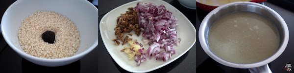 Picar fino la cebolla y los dientes de ajo. Poner a calentar el caldo de verduras.