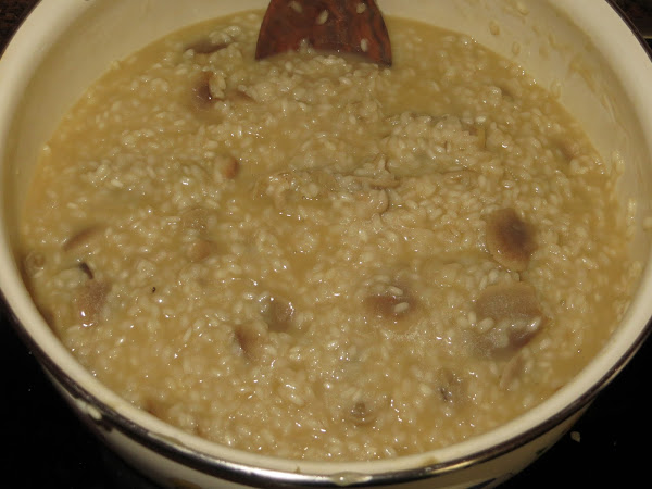 Ahora se añaden cinco cazos del caldo de verduras y comenzamos a darle vueltas al arroz para que suelte el almidón y se ponga cremoso. Según se vaya quedando sin líquido le debéis ir añadiendo más caldo, dependiendo del arroz que hayáis utilizado el tiempo estimado de cocinado del plato suele ser de 20 a 25 minutos. El número de cazos también es orientativo es bueno que lo vayáis probando para que veáis si está blanco y lo suficiente cremoso.