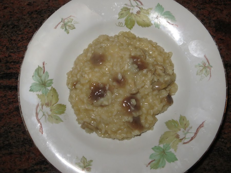 Ahora vamos a comenzar con nuestro risotto propiamente dicho, echamos la mitad de la mantequilla en una olla con un chorro de aceite y comenzamos a freír la cebolla en trozos muy pequeñitos. Cuando este pochada, añadimos el arroz le damos varias vueltas y echamos el vino blanco, dejamos que se evapore e incorporamos las setas que teníamos reservadas.