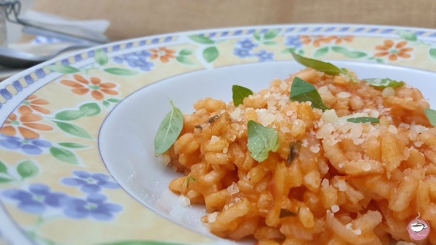 Ingredientes: 250 gr. de arroz arborio, 380 gr. de tomate frito casero , 1 cucharadita de mantequilla, 1 litro de caldo de pollo, 100 ml de vino blanco, 1 cebolleta, Albahaca fresca y 50 gr. de queso parmesano rallado.