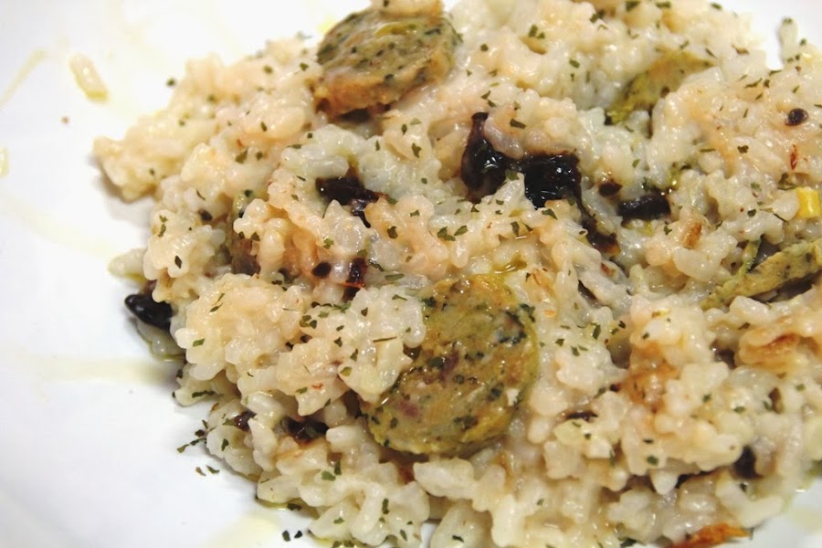 No hay domingo sin pollo asado, sin paellita o sin barbacoa, como íbamos a hacer este domingo, pero claro como no podía ser menos llovió, así que había que darle salida a las butifarras que tenía compradas y eso de encender fuego en casa como que de momento no, por lo que me decidía por un rico risotto con butifarra, pero como me parecía un poco soso le añadí unos tomates secos que le dan un toque fantástico al arroz....al final no hubo parrillada, pero si que hubo comilona y muchas risas.