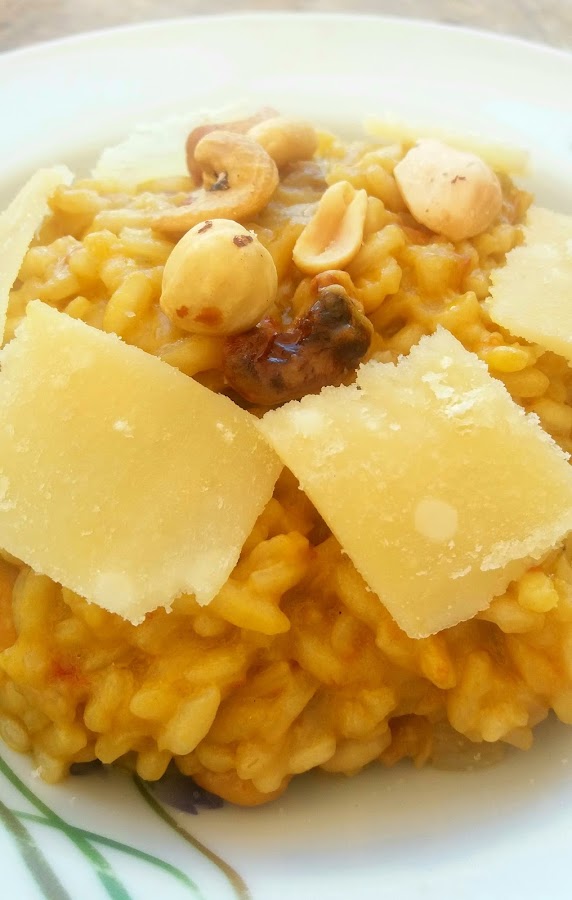 Para hacer el risotto, picamos lo más finamente que podamos la cebolla y el ajo y los ponemos a pochar con una cucharada de Aceite de Oliva Virgen Extra a fuego moderado. Cuando la cebolla empiece a estar transparente, echamos el vino (recordar, cuanto más bueno sea el vino, mejor sabrá) y dejamos evaporar el alcohol, entonces echamos el arroz y le damos unas vueltas para que coja más sabor durante unos minutos. Ahora, empezaremos a echar el caldo (recordar que hemos de mantenerlo caliente). Iremos echando el caldo poco a poco, echamos un cucharón, removemos hasta que lo absorba el arroz y volvemos a echar otro cucharón, así hasta que acabemos él. Como a media cocción, partimos los tomates secos (yo los dejé en remojo unas horas) y los repartimos por el arroz. Cuando acabemos el caldo, probamos a ver si el arroz está en su punto, yo no he necesitado más cantidad de líquido. Ya sólo queda poner los frutos secos en una sartén y rehogarlos un poco con un hilillo de aceite, dejamos que se doren un poco y los incorporamos al arroz. Cortamos el queso Parmesano en lascas y las echamos al arroz, movemos hasta que se integren y listo para comer!!!! Un gran sabor. Nosotros lo comimos con unos ricos calamares a la plancha, pero está tan rico que me lo hubiera comido solo... ummmm.
