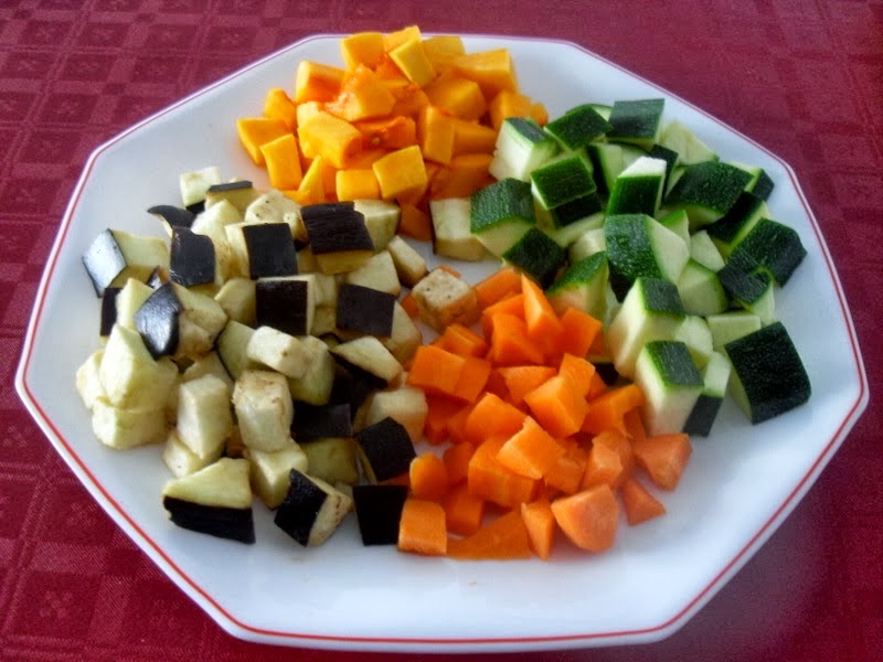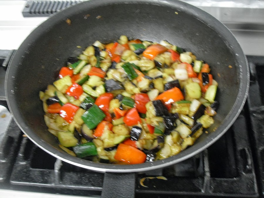 Mientras tanto, en una sartén poner a calentar aceite y agregar los ajos, la cebolla, y los champiñones. a continuación añadir el resto de verduras (excepto el tomate que se añadirá más tarde). Remover y saltear para que queden tiernos si que se doren