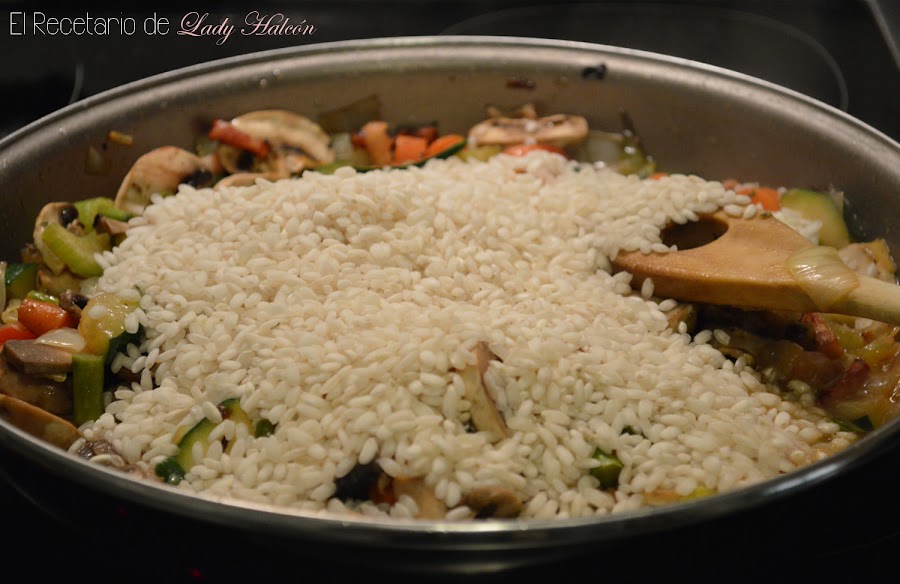 Deja que se hagan unos cinco minutos, removiendo de vez en cuando, y añade el arroz.