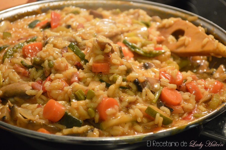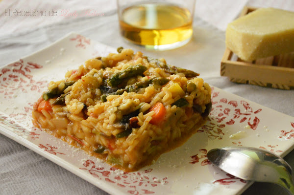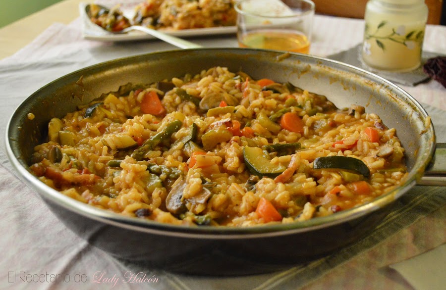 No sé si por el sabor o por el día gris, pero este plato me recordó al primer risotto que publicamos en el blog, aquel que hizo que me reencontrara con el arroz y lo mirara con mejores ojos... Pese a la variedad de verduras que lleva, tiene un sabor muy suave, aunque consigues disfrutar con cada bocado porque te sabe diferente. Y cuando te encuentras con un trocito de bacon... ¡mmmmhhhh! ya es una delicia total.