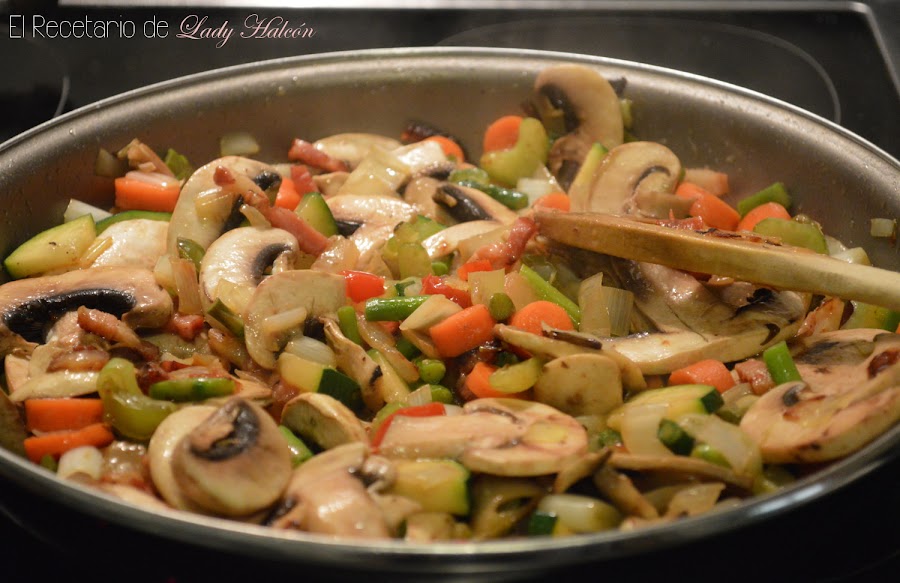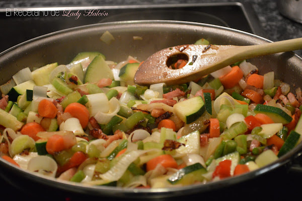 Además, es un plato muy fácil de adaptar a lo que tengamos en la nevera. Y si lo queréis hacer vegetariano, solo tenéis que cambiar el bacon por tofu u otra cosa que destaque entre las verduras y listo.