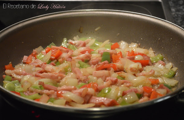 En una sartén a fuego medio-alto añade un buen chorro de aceite y, cuando esté caliente, añade la cebolla, los pimientos rojo y verde, el bacon y una pizca de sal. Remueve de vez en cuando para que no se pegue.