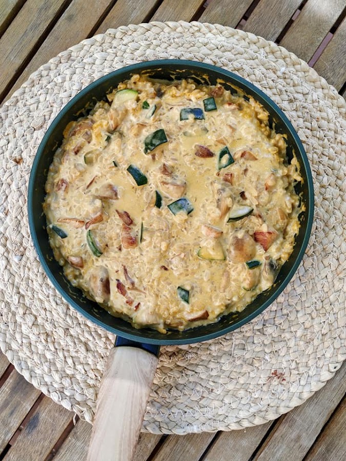 Cocemos el arroz y lo dejamos "al dente", troceamos la pechuga en tacos, y la cebolleta en juliana, en una sartén con un chorro de aceite de oliva sofreímos la pechuga junto con la cebolleta, lavamos el calabacín y los champiñones y los cortamos en trozos, cuando la pechuga y la cebolleta estén doraditas agregamos el resto de verduras, salteamos durante unos minutos, añadimos el caldo de zanahoria y dejamos a fuego medio unos minutos, ponemos el arroz, sazonamos al gusto y por último añadimos la crema vegetal de arroz, movemos todo bien durante unos minutos y servimos.