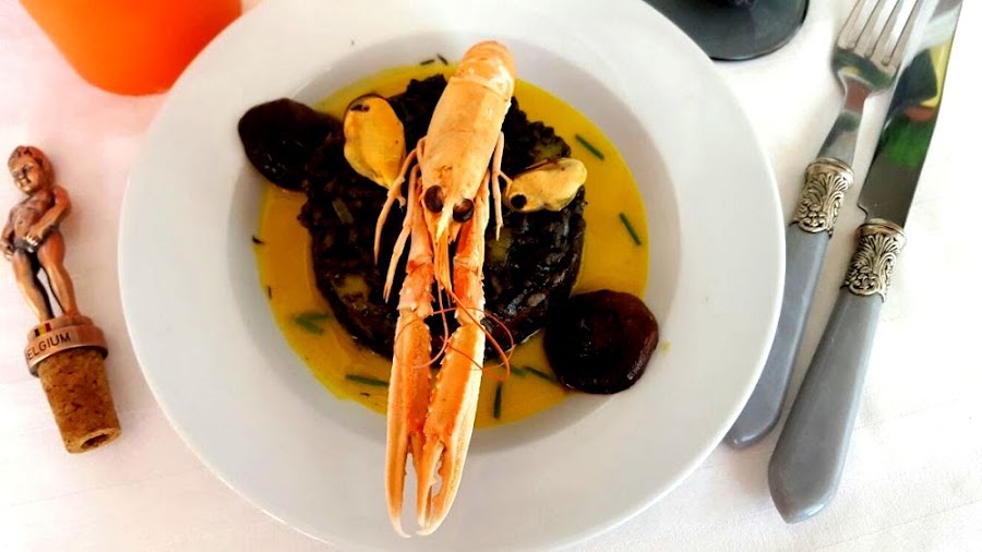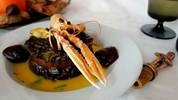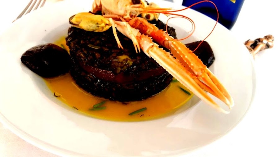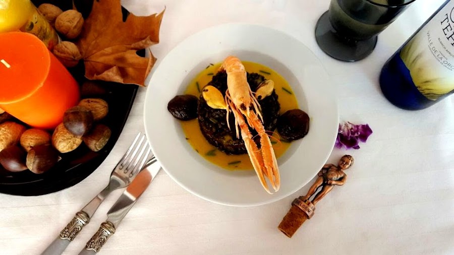 Risotto negro con chocolate, crema de calabaza con azafrán, calabaza caramelizada con setas caramelizadas y mariscos. Un plato para disfrutar de todos los sentidos; la vista, el olfato y el gusto.