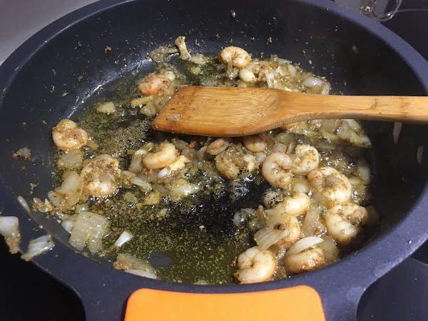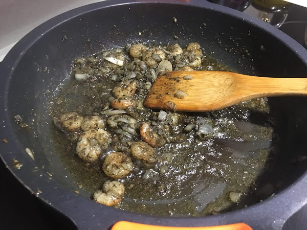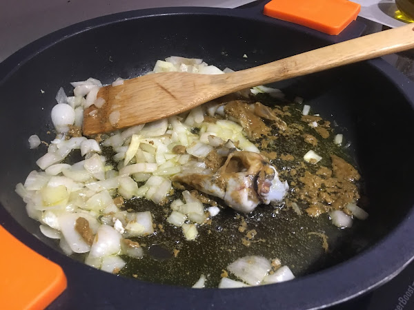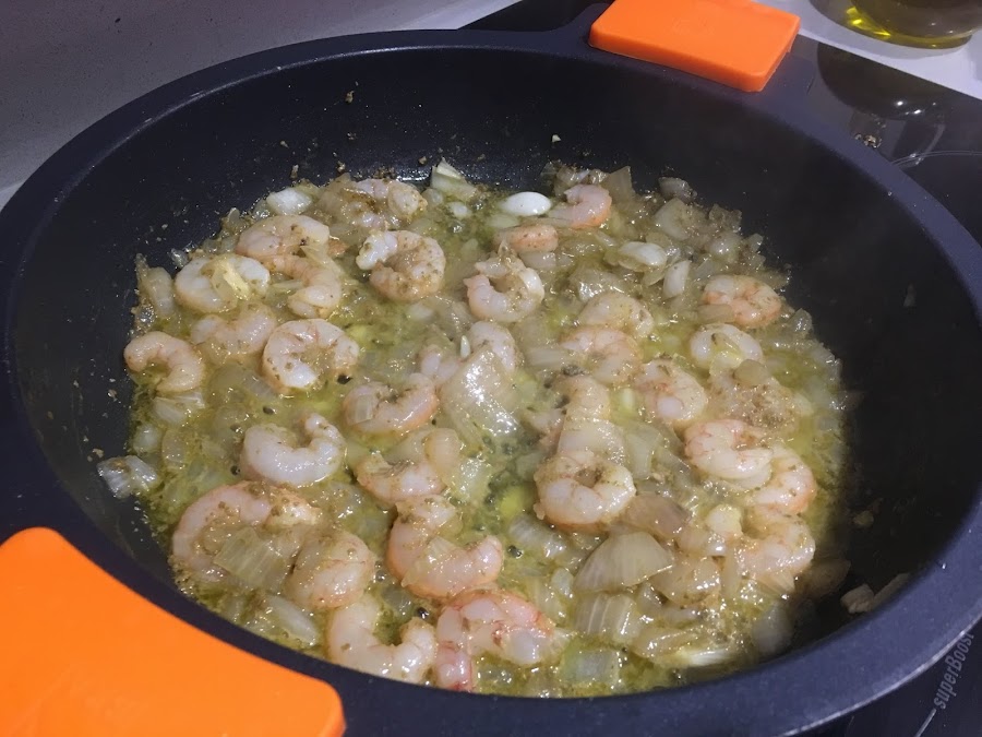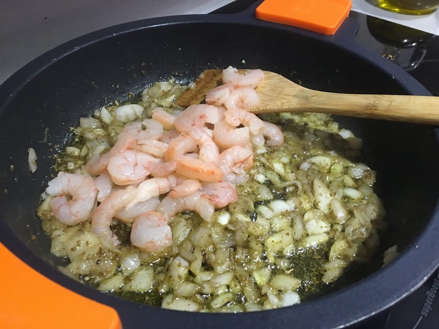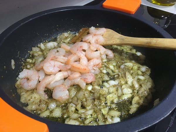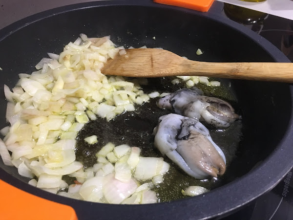 4. Añadimos las dos melsas de la sípia fresca a la cazuelo junto con la cebolla. Seguimos sofriendo hasta que suelten toda su salsa. Cuando hayan soltado toda la salsa, las retiramos y añadimos las gambitas peladas. Rehogamos 3-4 minutos.