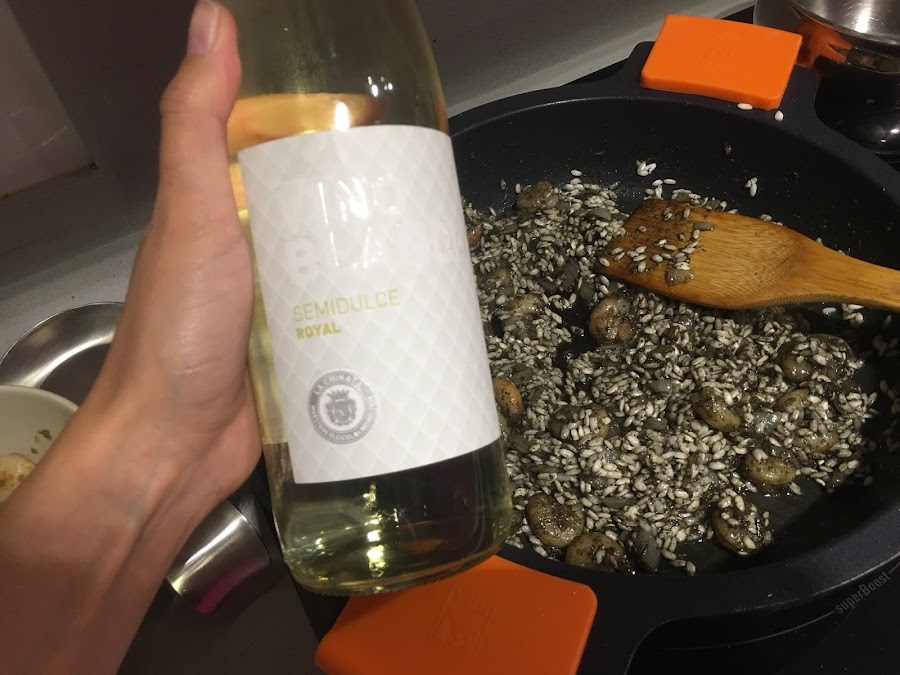 6. Subimos el fuego y incorporamos el vino blanco de La Chinata, rehogamos hasta que se evapore por completo el alcohol.
