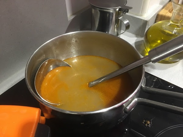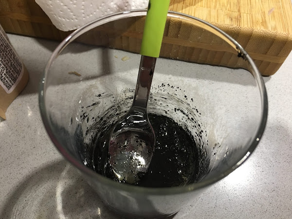 3. En un vaso ponemos las dos tintas de sepias frescas junto con una cucharada de aceite, removemos hasta disolver por completo. Reservamos para más adelante. Yo estas tintas las tenía reservadas en el congelador. Siempre que compro sepia fresca pido que me guarden la melsa y la tinta, para poder aprovechar en otras ocasiones.