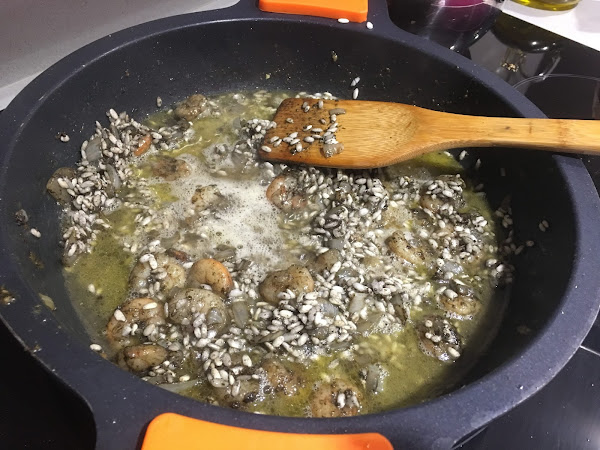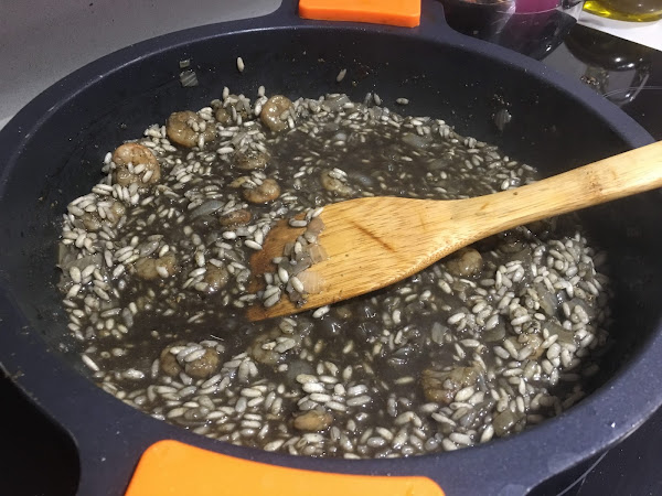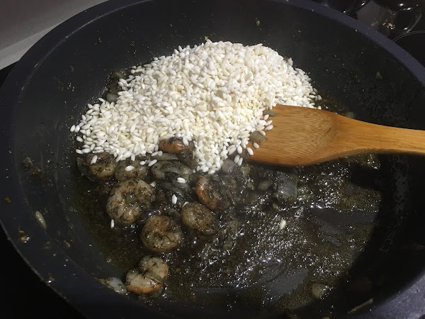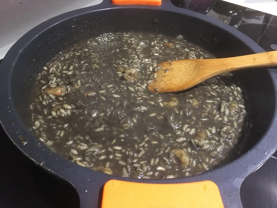 5. Cuando las gambitas estén hechas retiramos unas 10 para el emplatado final. Añadimos la tinta y seguidamente el arroz a la cazuela que tenemos reservado y rehogamos durante un par de minutos.