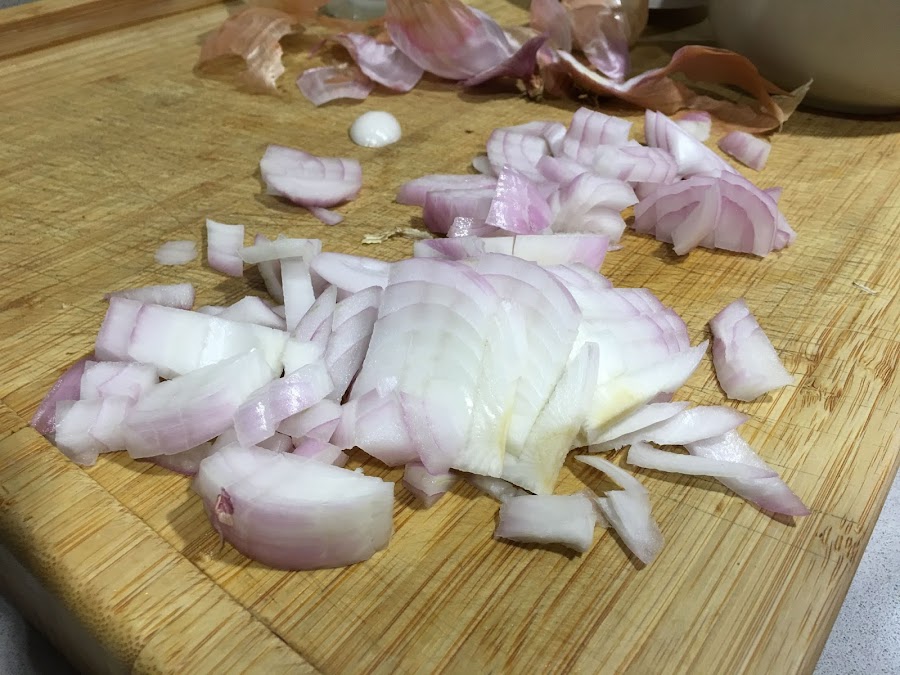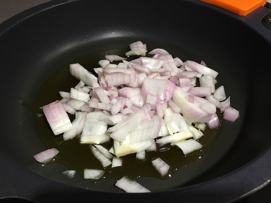 2. Cortamos en brunoise la cebolla blanca. En una cazuela ponemos las dos cucharadas de aceite de oliva. Añadimos la cebolla, salamos con sal de gambas de Palamós de Salnostrum y rehogamos a fuego medio durante 5 minutos.