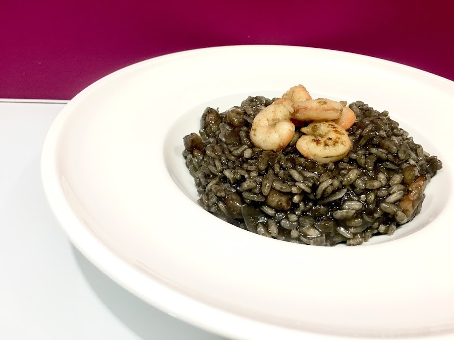 ponemos el risotto en el fondo del plato y coronamos con las gambitas que habíamos reservado. Servimos y disfrutamos.