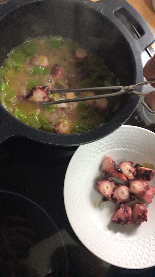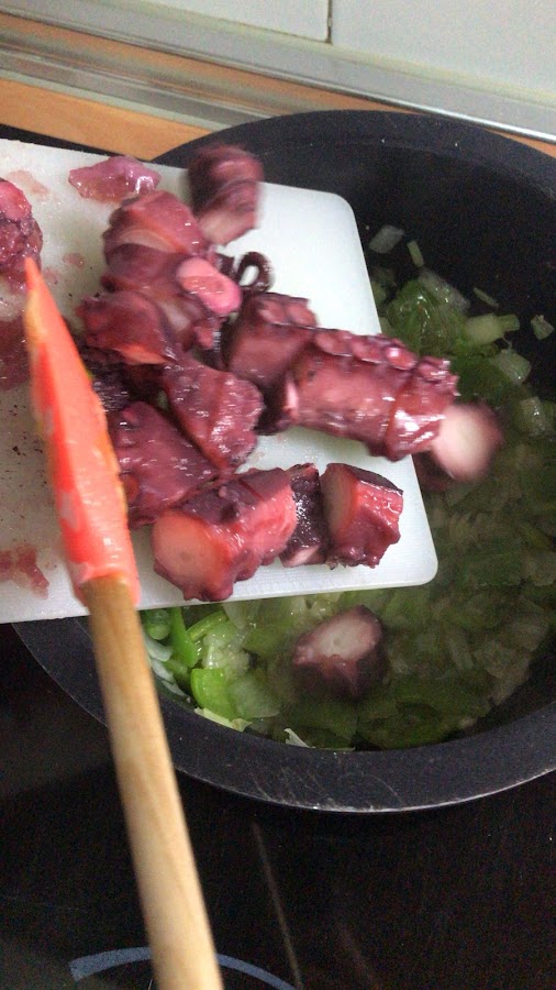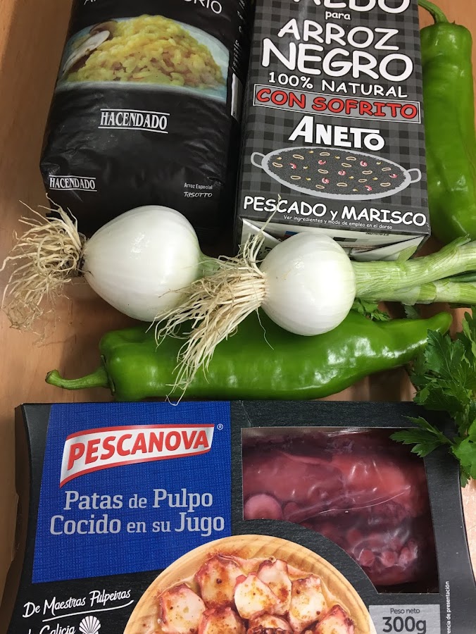 Me he ayudado de los productos que ya venden para facilitar la labor: las patas de pulpo ya cocido de Pescanova y el fabuloso caldo para arroz negro de Aneto.
