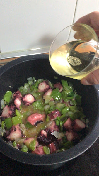 Se añade el pulpo ya cocido cortado en trocitos y se vierte el vasito de vino blanco: