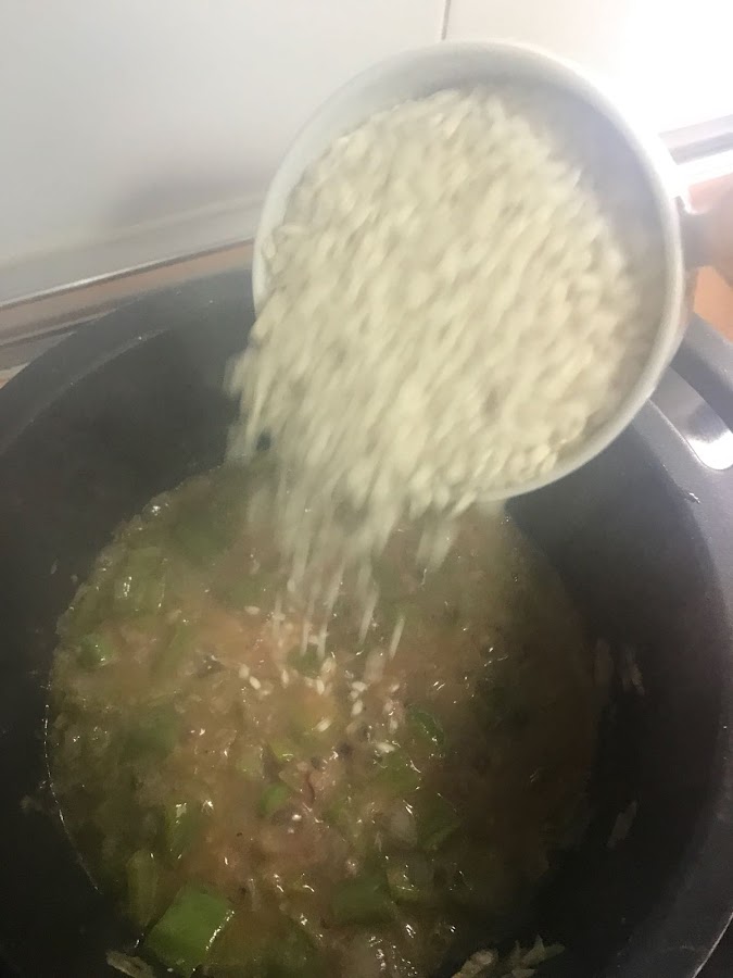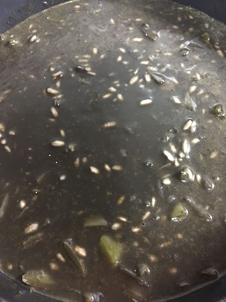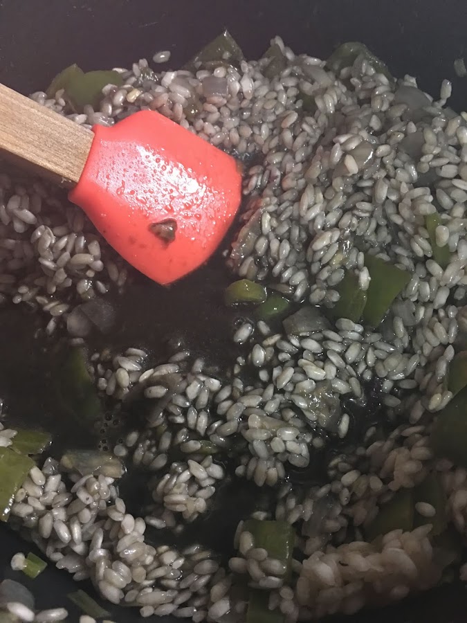 Se añade el arroz y se calienta el caldo negro (puede ser en microondas). Se le da unas vueltas para que se impregne el grano: