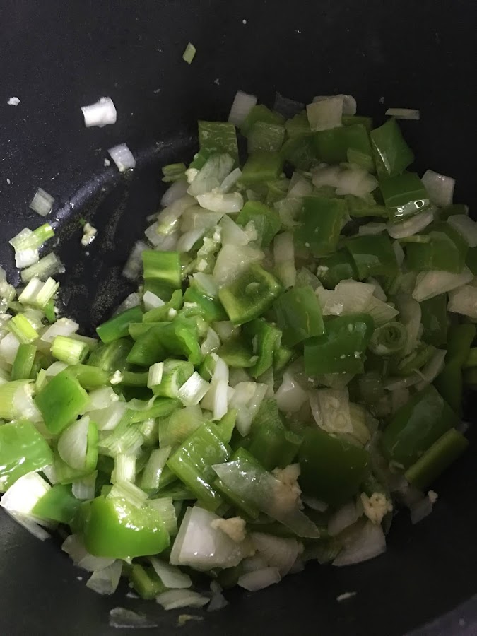 lascas de parmesanoSe pone en la cazuela donde se vaya a preparar el arroz el aceite de oliva. Se calienta suavemente y se pican los pimientos, el ajo y la cebolleta.