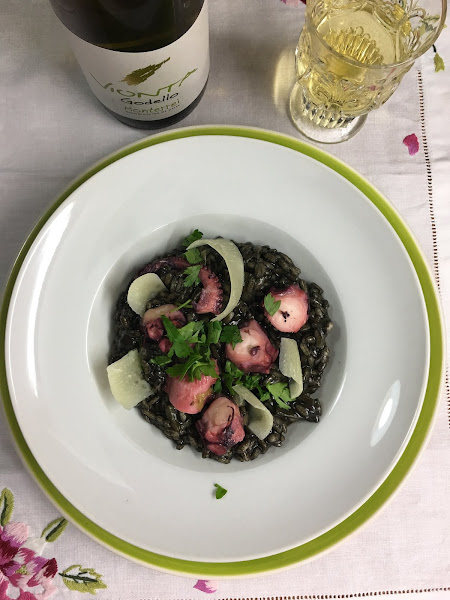 Este atractivo plato veneciano, cuyo original lleva calamares en lugar de pulpo, se llama Risotto al nero di seppia y está para chuparse los dedos.