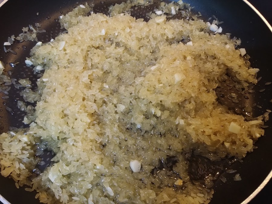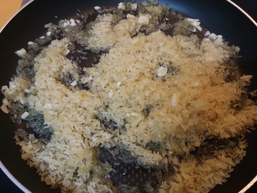 Añadimos el arroz y los rehogamos durante un par de minutos removiendo.