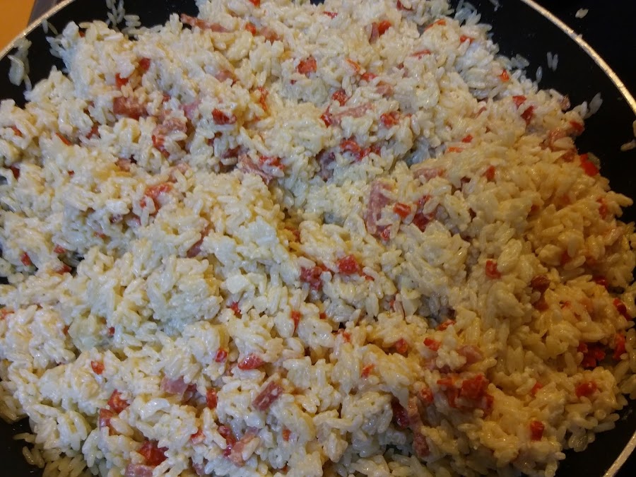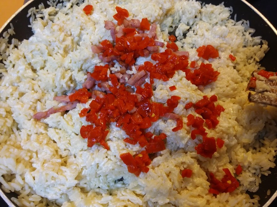 Añadimos el beicon ya doradito y los pimientos del piquillo picados.
