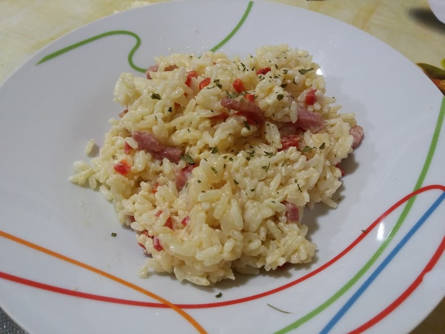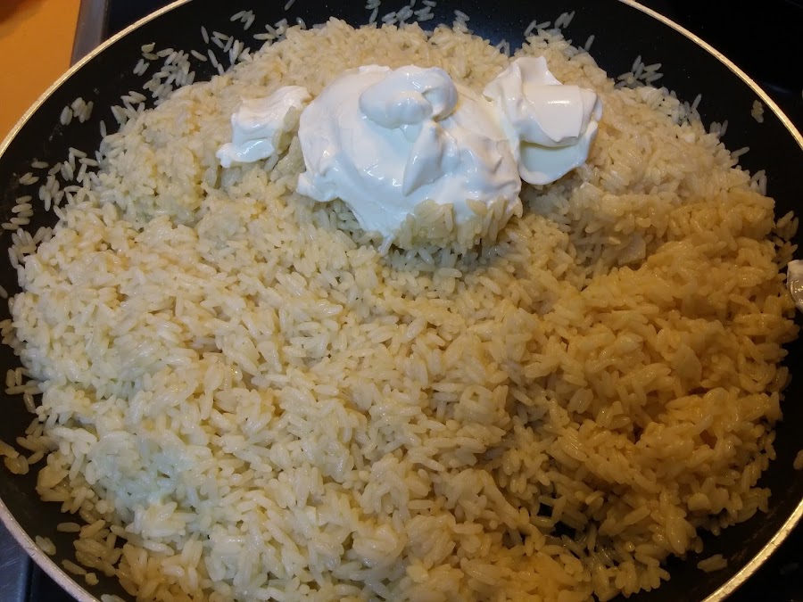 Cuando el arroz esté listo añadimos el queso para untar. Removemos.