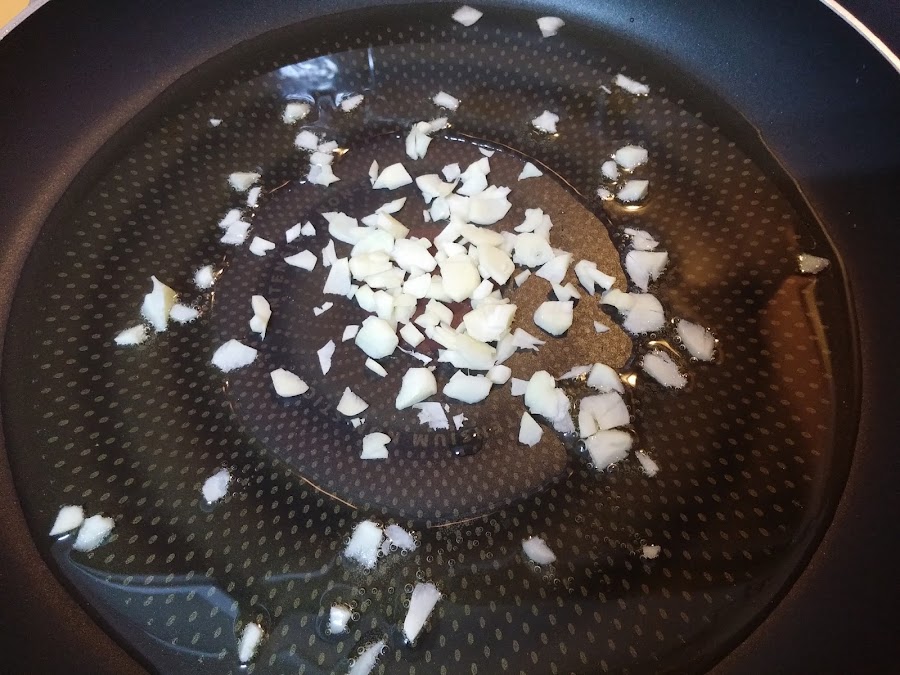 Picamos los ajos y los rehogamos en una sartén amplia con un chorreón de aceite.
