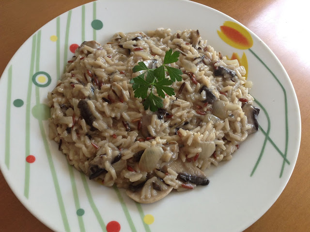 En esta ocasión os traigo una receta que publiqué hace tiempo en mi perfil de la plataforma cookpad y que titulé "Arroz salvaje", como una fusión entre lo mediterráneo y lo oriental, ya que, en lugar de emplear arroz de las variedades que suelen ser comunes en los risottos, como el carnaroli o el arborio, utilicé el llamado "arroz salvaje", una mezcla de arroces que, en realidad, son para guarnición, de hecho, yo a veces lo utilizo como acompañamiento de un buen pollo al curry. Por eso en este caso, aunque el auténtico risotto no lo lleva, en la receta he puesto nata (crema de leche), ya que es un arroz largo que no suelta el almidón que sueltan esas otras variedades pero queremos lograr la cremosidad típica. Las proporciones os darán más o menos para 4 platos, para que calculéis lo que necesitéis.