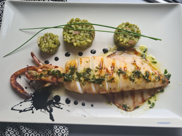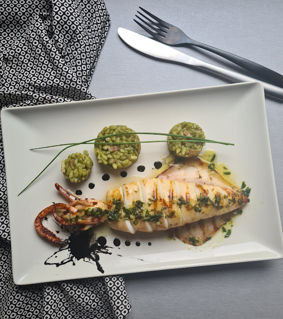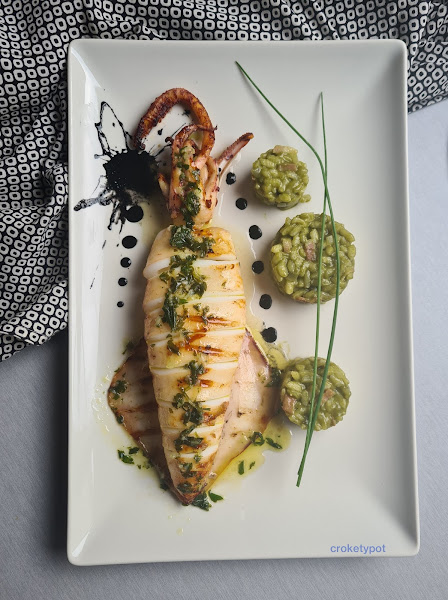 ELABORACIÓN: Limpiamos el calamar. Preparamos un majado con el ajo, perejil, sal , machacamos en el mortero, añadimos aceite y limón y lo dejamos que tome sabor mientras hacemos el risotto.