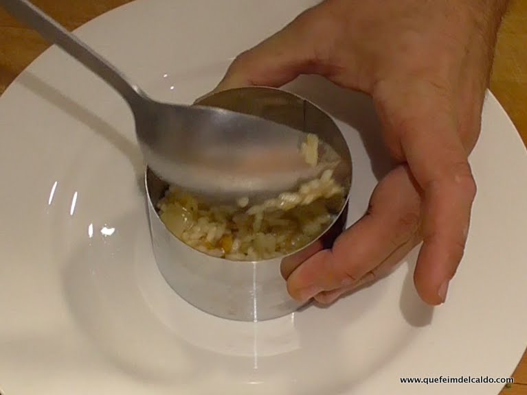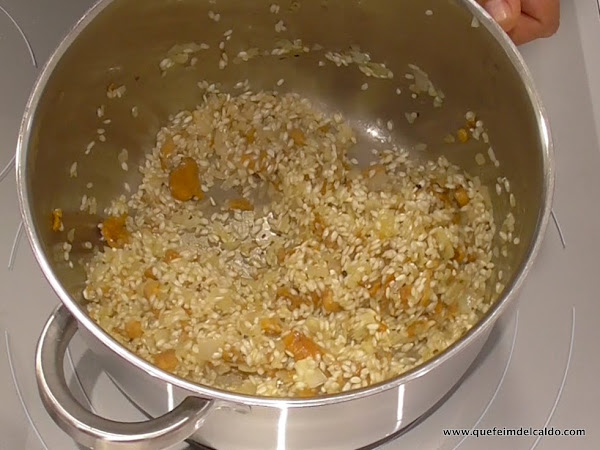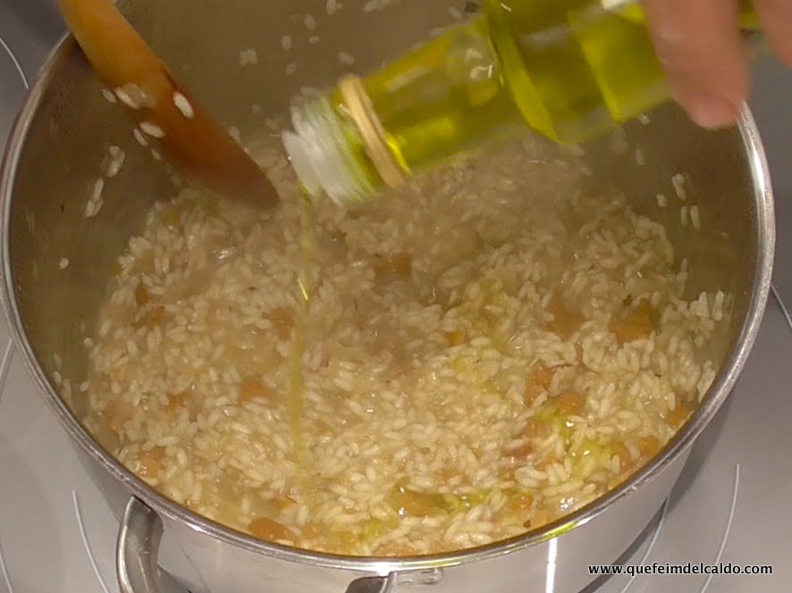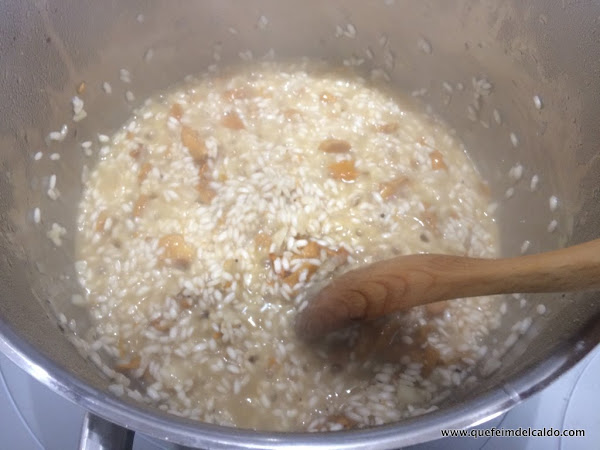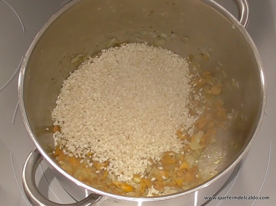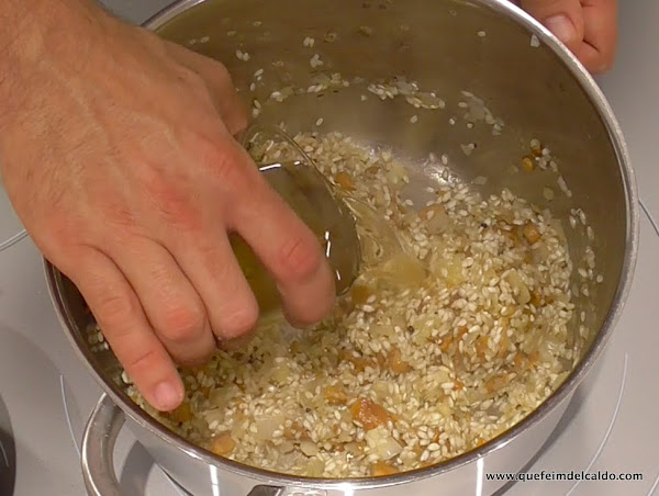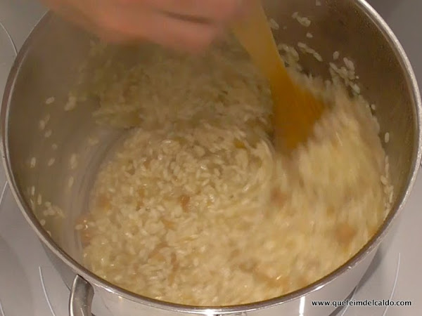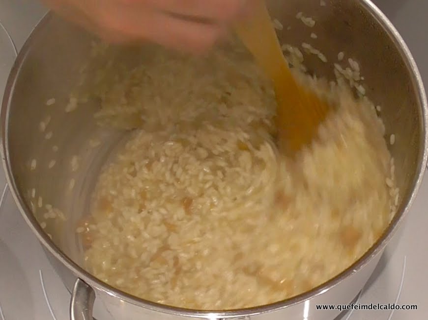 Es importante, muy importante mover constantemente para que el arroz vaya soltando poco a poco el almidón y así crear una cremosidad en el grano.