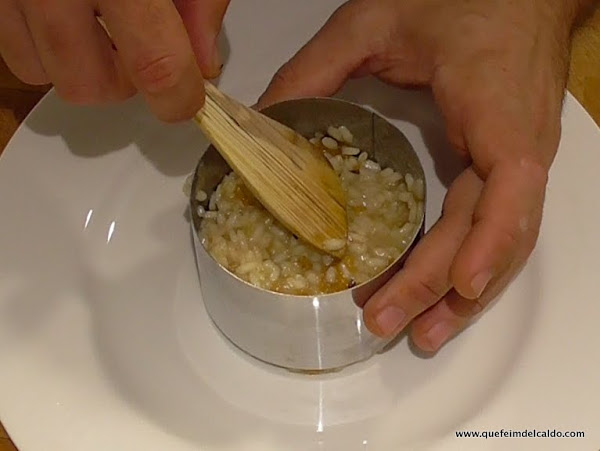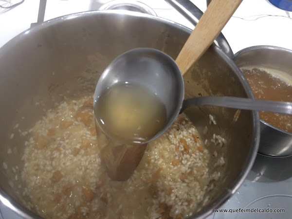 Una vez reducido bajamos la potencia del fuego a 7-9 y vamos mojando el arroz, una cazo cada minuto aproximadamente hasta que se terminen los 15 minutos de cocción.