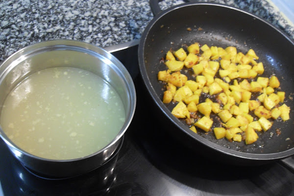 Sofreír ligeramente la cebolla y seguidamente el ajo. A continuación añadir la calabaza y dejar sofreír unos 7 minutos, bajar el fuego.