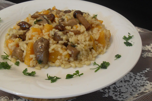 Agregar el caldo caliente de ave cubriendo y un poco más el arroz, dejar cocer removiendo de tanto en tanto durante 15 minutos. Salpimentar y continuar añadiendo caldo q medida que le haga falta.